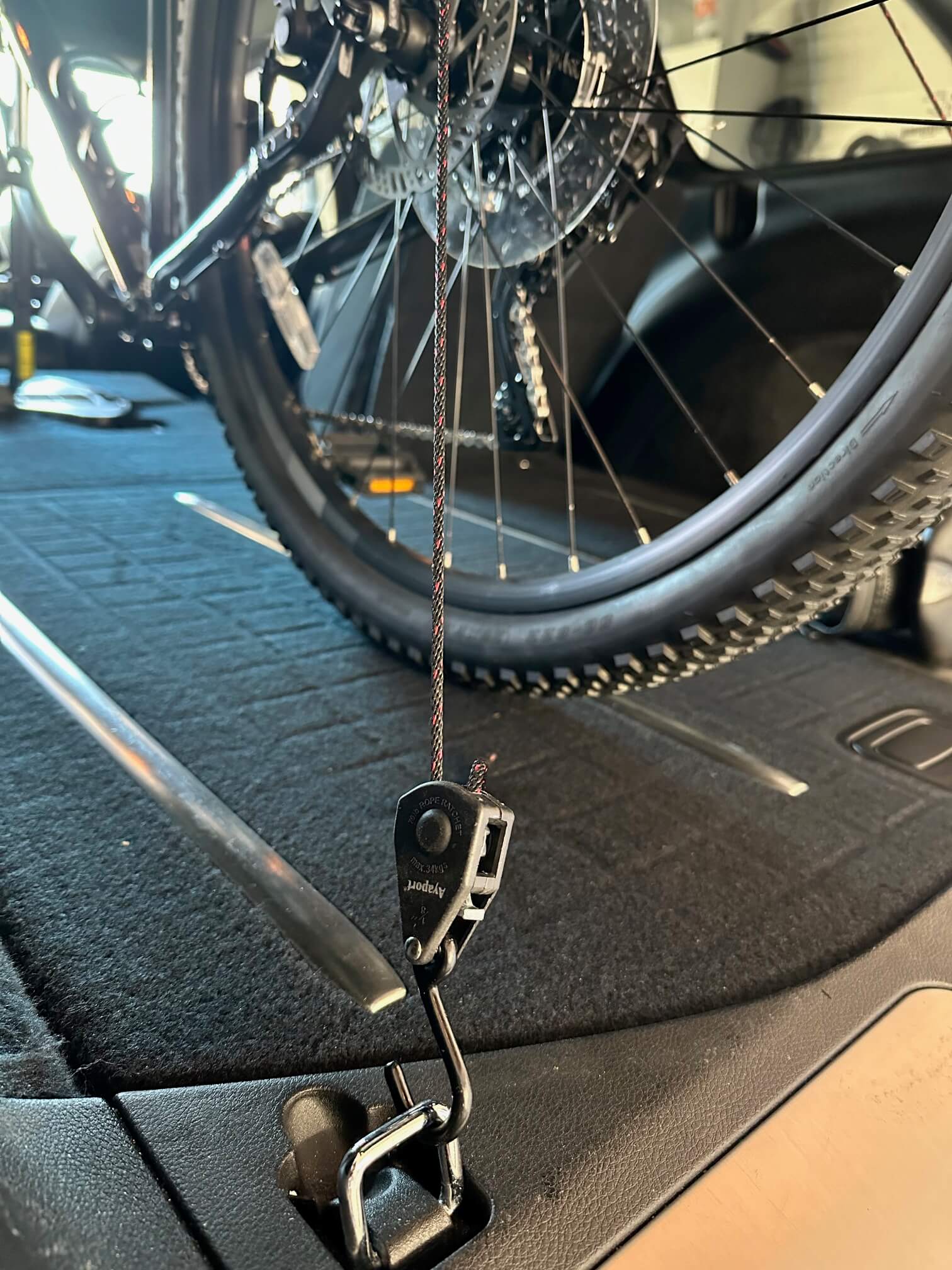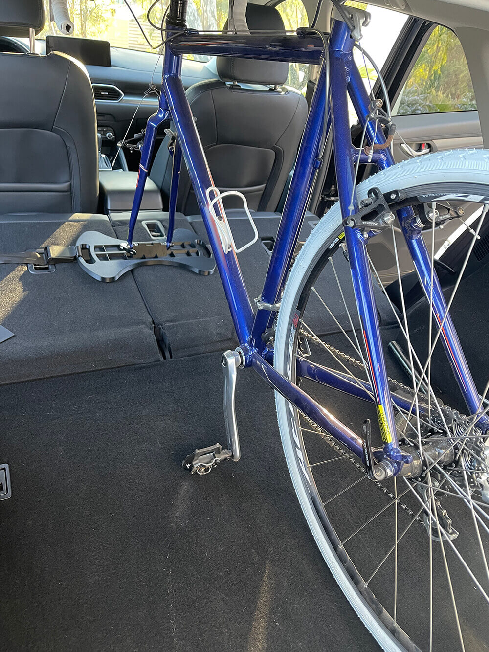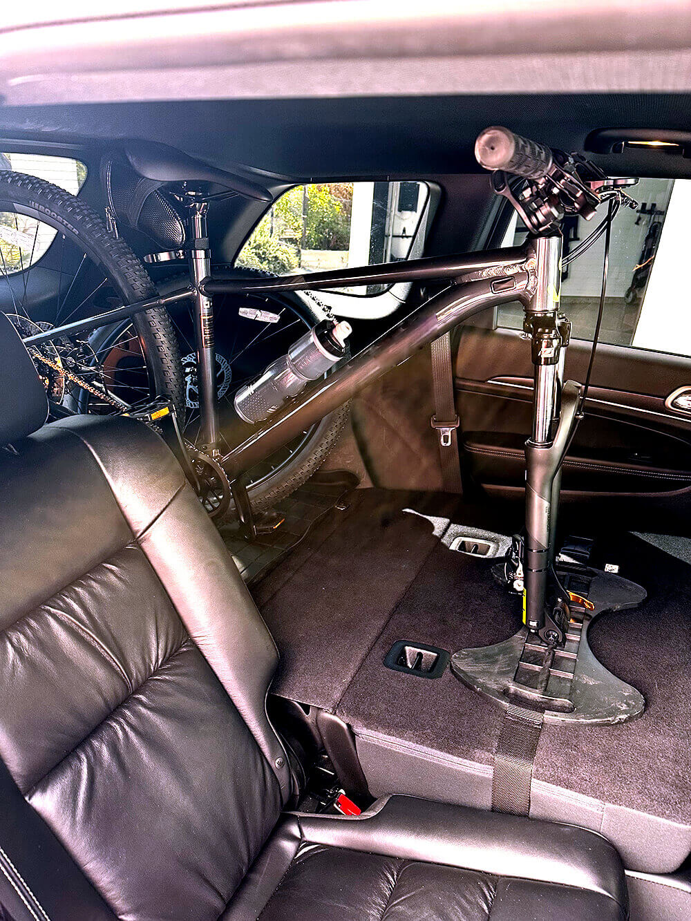 Transport your bike upright, and securely inside your vehicle with the (Patent Pending) BikeBuckle® utilizing the seatback. No need for a bike rack. This allows for more room inside your car for your front wheel, and anything from gear, another bike, another passenger, groceries, (a case of beer) or even a dog. No more lifting your bike on top of your vehicle!