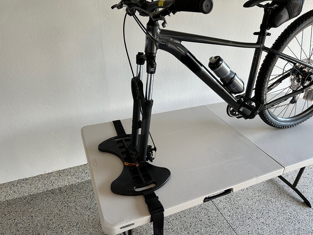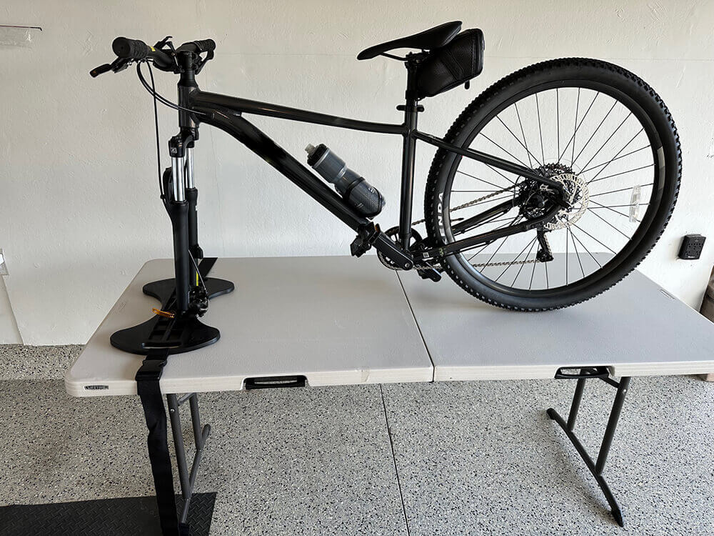 Take advantage of the security features of your vehicle to protect your bike when you’re parked. No more having to lock your bike to your rack, and locking your rack to your vehicle. Strap the (Patent Pending) BikeBuckle® to a tabletop and mount the bike right on it for an instant at home bike stand!